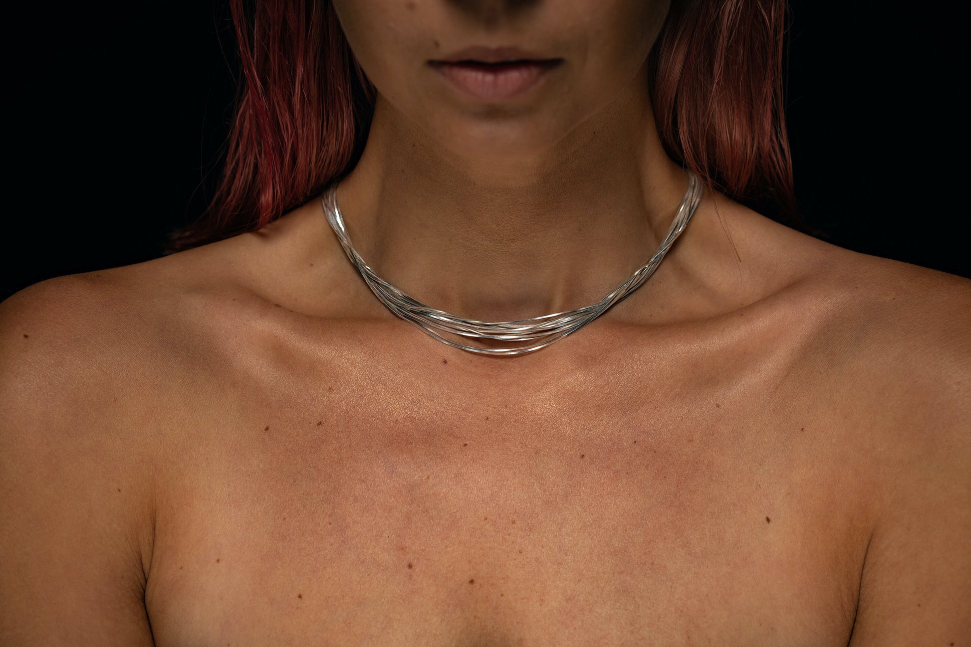 Rhodium plated layering choker is made of 15 snake chain strands. This delicate yet sparkling necklace shines bright on any party. Elegant necklace and is the perfect gift.