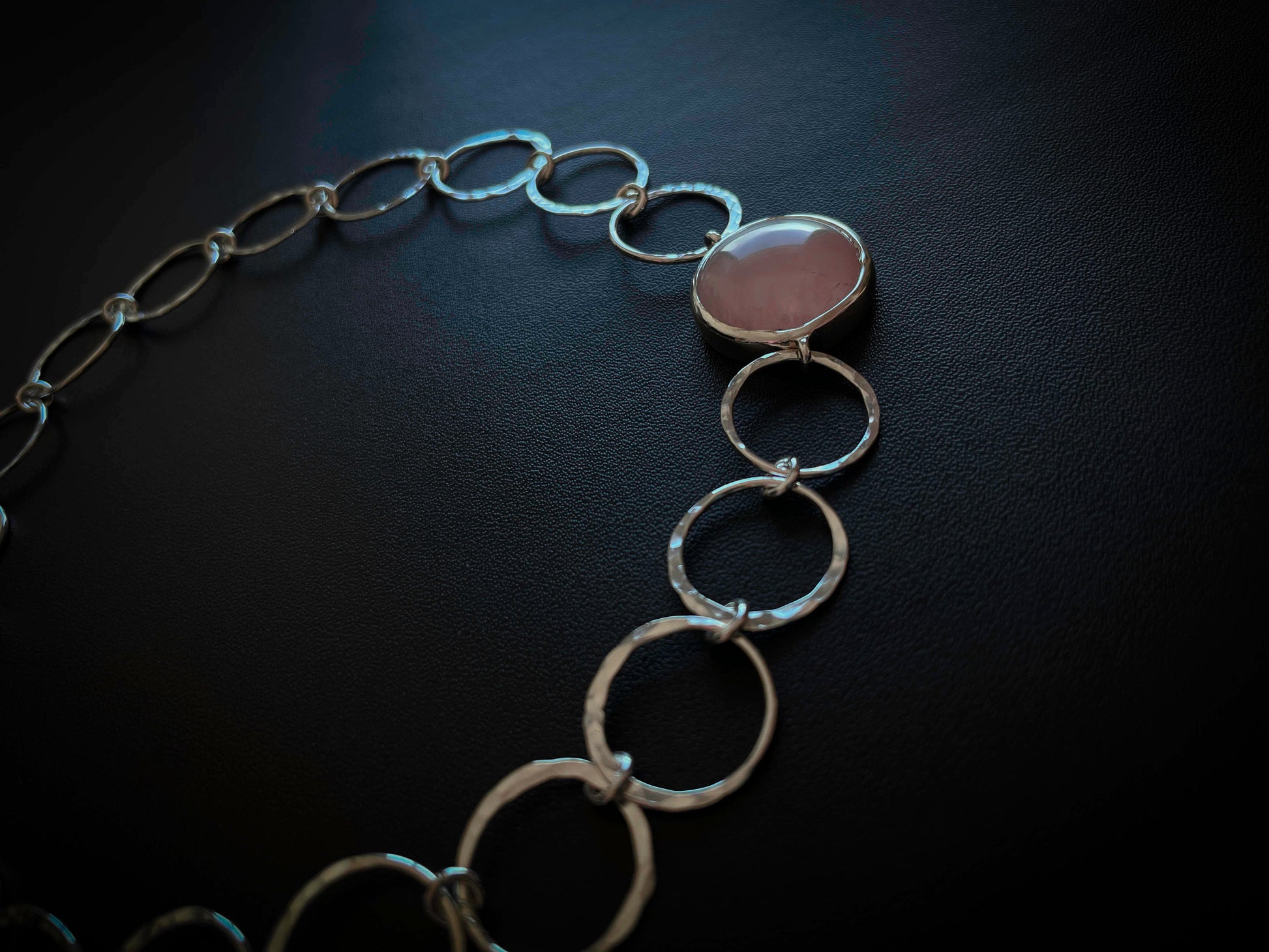 Get ready to charm with our TENDERNESS Rose Quartz Silver Collar Necklace which is one of a kind! This stunning piece is fully handmade, featuring a soft rose quartz and a sterling silver links for durability and comfort.